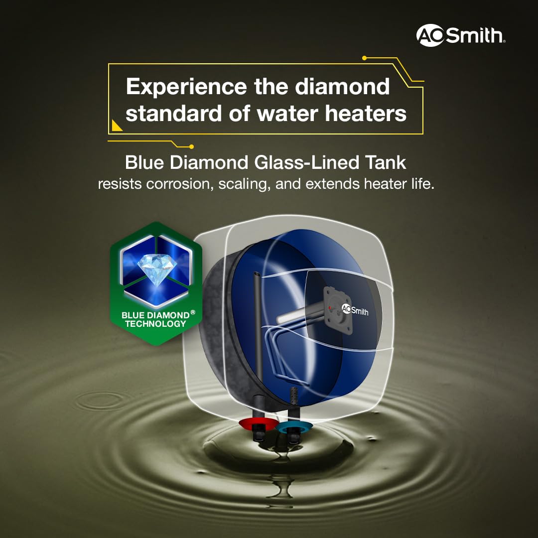 - DURABLE & ELEGANT DESIGN: This AO Smith 10 litre water geyser combines a glossy ABS plastic body and blue diamond glass-lined tank, offering 2X corrosion resistance. It’s the perfect blend of durability and style for your bathroom.