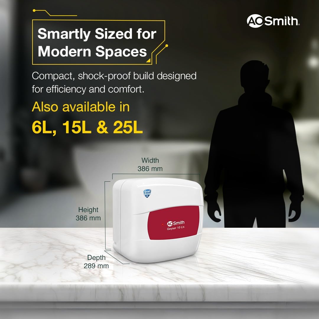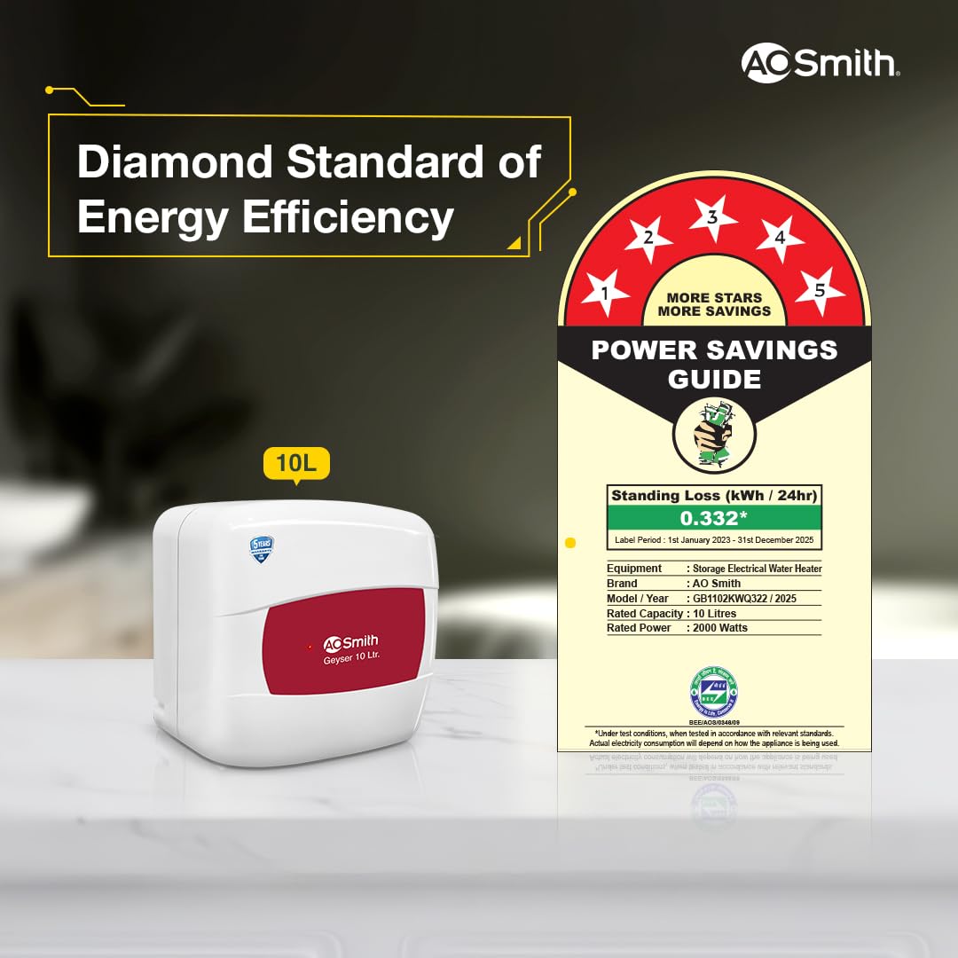 - ENERGY-EFFICIENT 5-STAR GEYSER: Save on electricity bills with this BEE 5-star rated AO Smith electric geyser 10 litre. Designed for eco-conscious homes, it ensures efficient heating while reducing energy consumption, making it an ideal choice. BEE label Period: 1st Jan, 2023 to 31st Dec, 2025