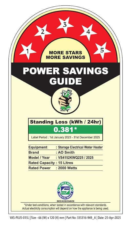 - ENERGY-EFFICIENT 5-STAR GEYSER: Save on electricity bills with this BEE 5-star rated 15-litre geyser. Perfect for eco-conscious homes, this water heater ensures efficient heating while reducing energy consumption, making it a top choice in India. BEE label Period: 1st Jan, 2023 to 31st Dec, 2025.