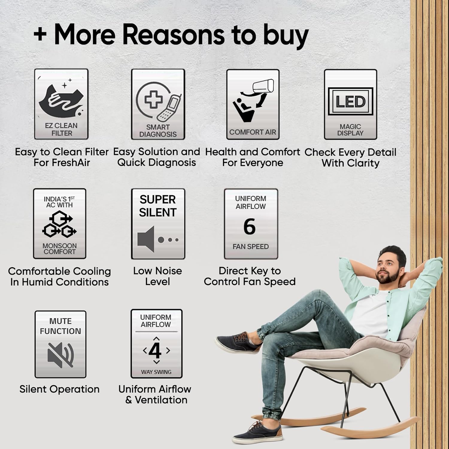 - Special Features: Gold Fin+ – Increase durability, Ocean black protection, Ez Clean Filter, Low gas detection, 100% Copper Condenser, 6 Fan Speed steps; Hi grooved Copper; Smart Diagnosis System, Comfort Air, Monsoon Comfort/Fresh Dry, Auto Clean, Mute Function, On/ Off Timer, Sleep Mode, Auto Restart (Memory), On/Off Indicator, Dehumidifier; Diet Mode Plus