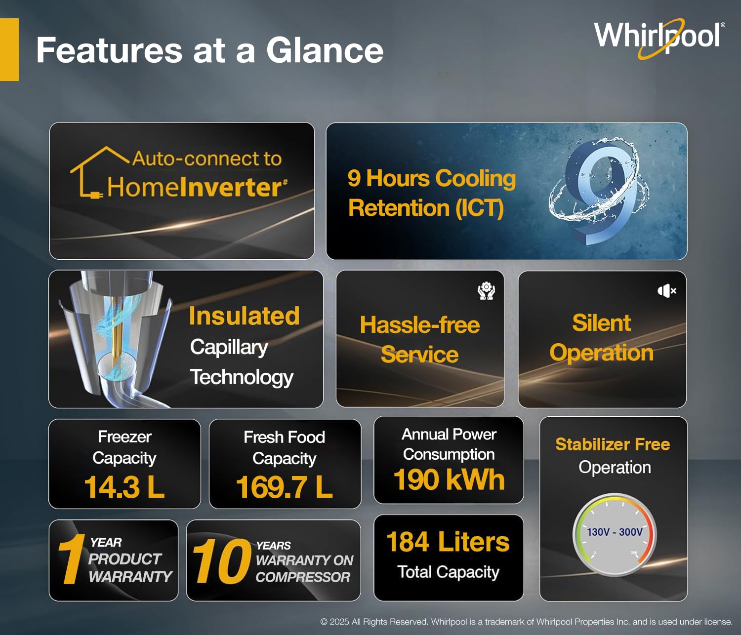 - Brand Specific Features – Upto 9 hours of cooling retention during power cuts, Easy Manual Defrosting, Jumbo Storage Up To 3, 2L Bottle Storage, Insulated Capillary Technology, Auto Connect To Home Inverter, Large Vegetable Crisper, Honey Comb Lock In Technology & Quick Chill Zone